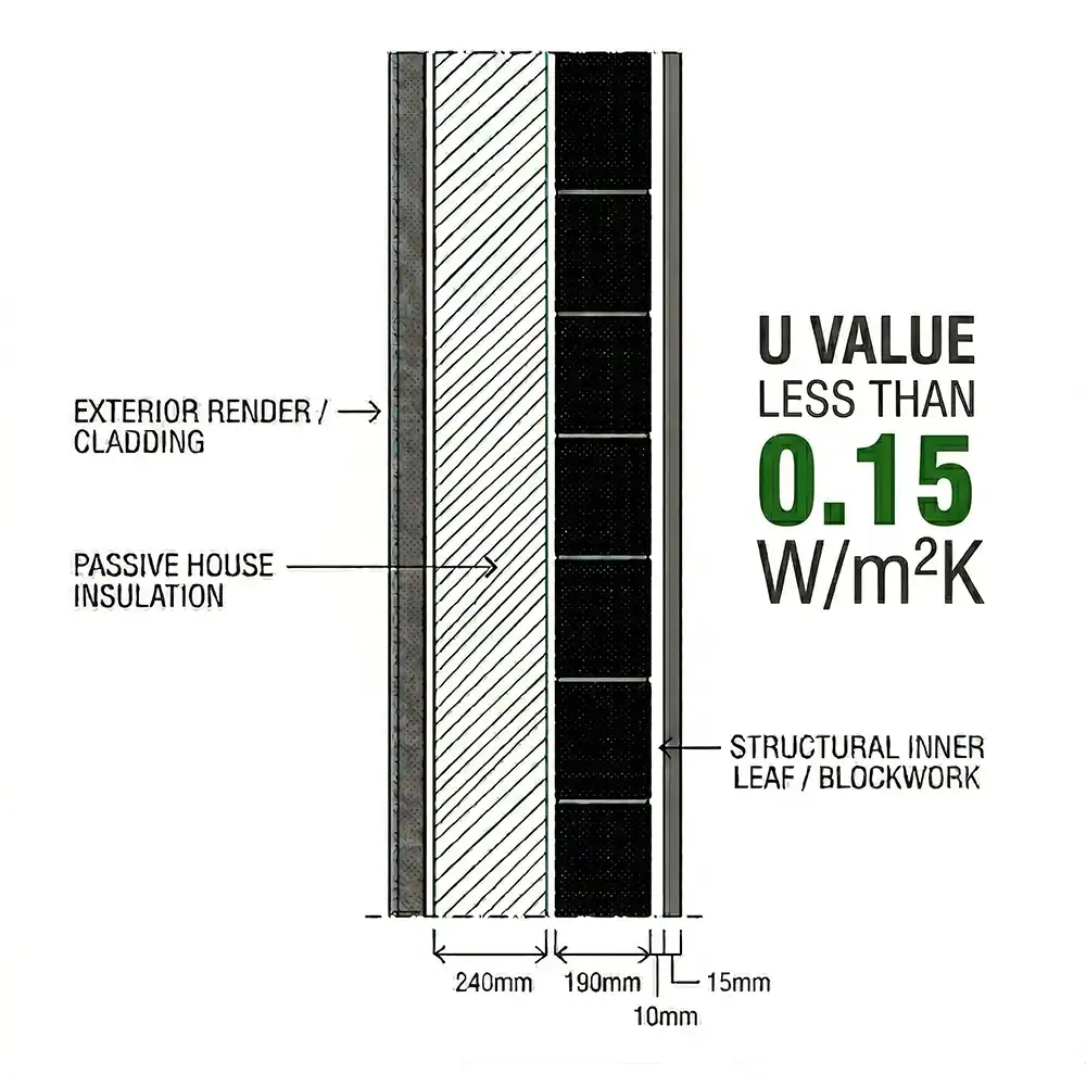 A fabric-first approach with high levels of continuous insulation to minimise heat loss throughout.