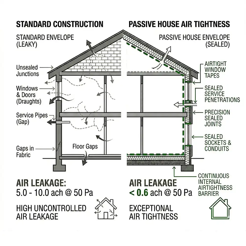 Airtight construction across all junctions, to eliminate uncontrolled heat loss through leaky fabric elements.