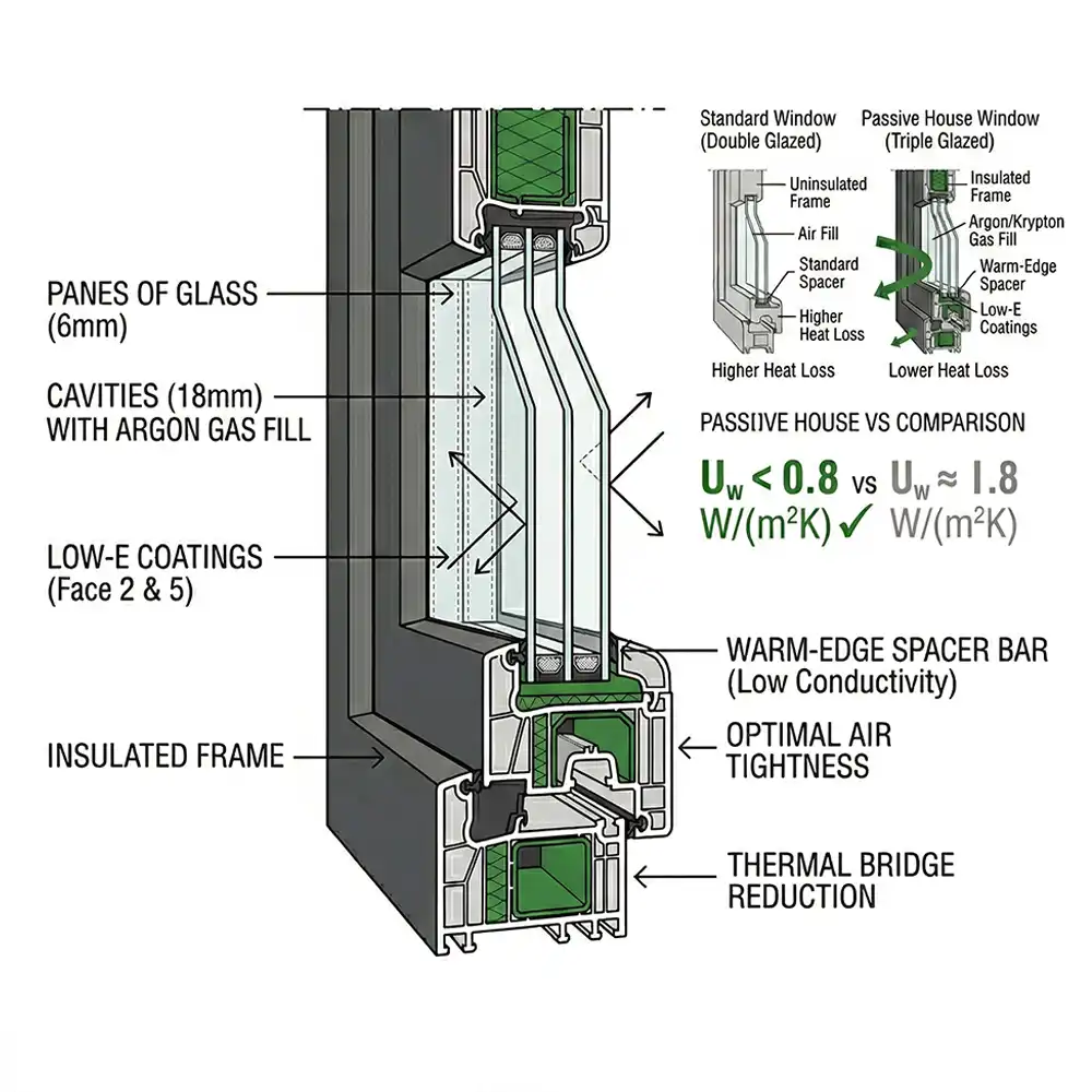 High-performance triple-glazed windows and doors, oriientated to maximise useful solar gains, whilst limiting unwanted solar energy through appropriate shading.