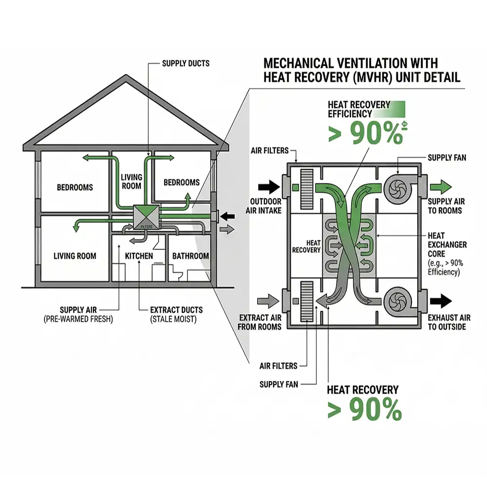 Mechanical ventilation with heat recovery (MVHR) for efficient, balanced airflow, creating a healthy, filtered internal environment.