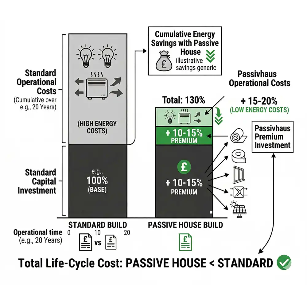 Optimised building design to lower service and fabric costs to balance the Passive House 'premium'.